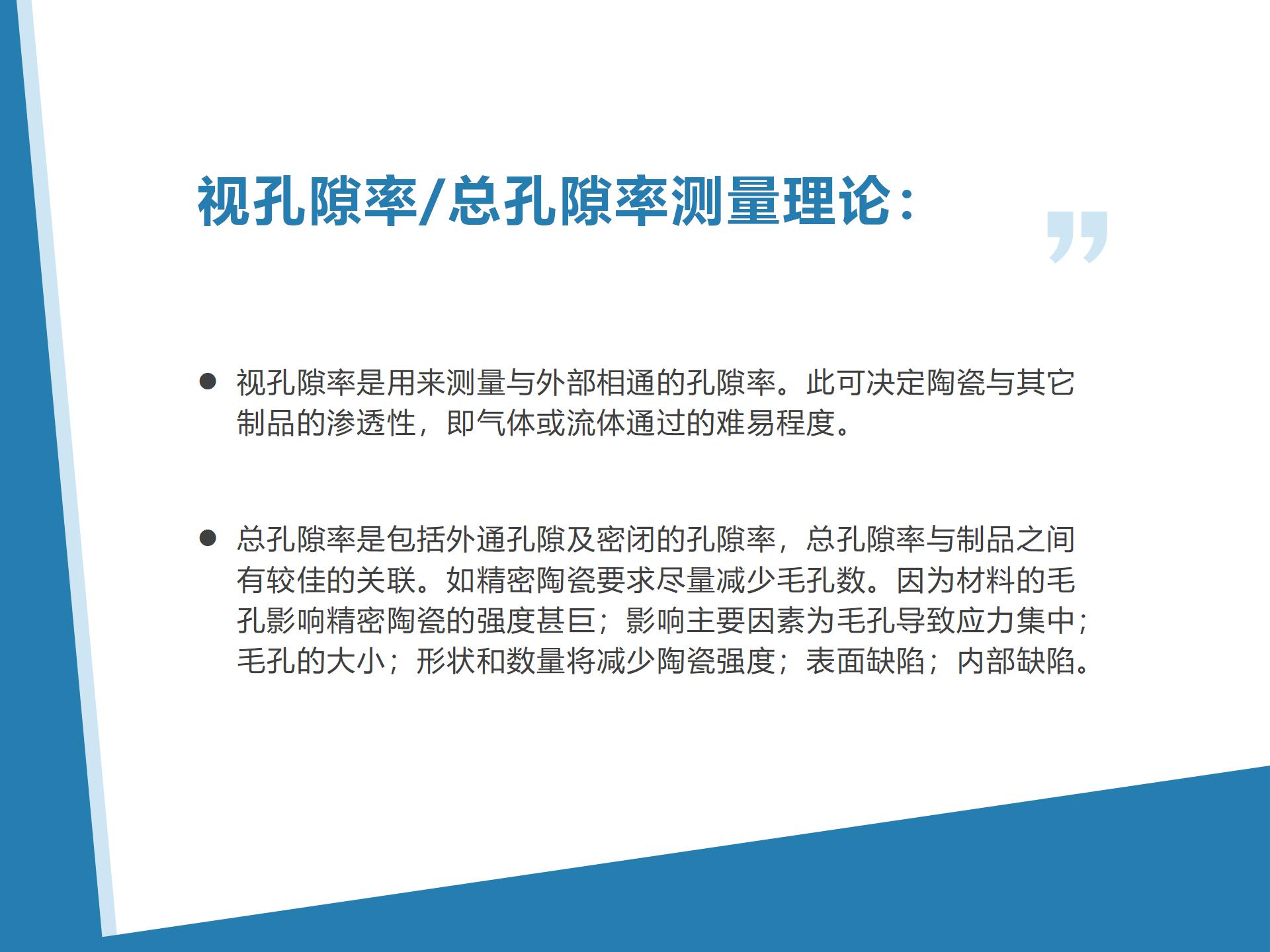 視孔隙率測量理論:是用來測量與外部相通的孔隙率。此可決定陶瓷與其它制品的滲透性,即氣體或流體通過的難易程度。