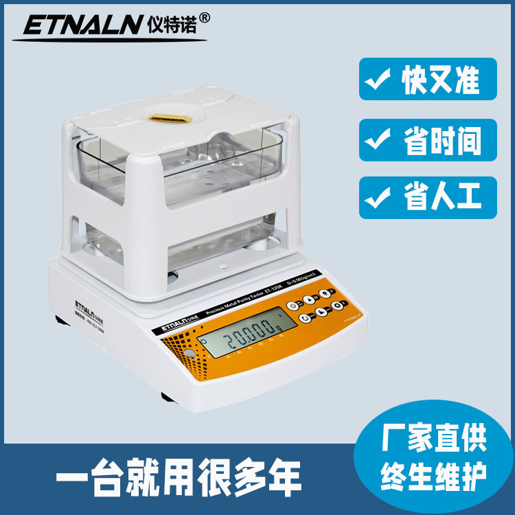 儀特諾黃金密度計(jì)_貴金屬純度檢測(cè)儀_黃金首飾檢驗(yàn)真假的儀器ET-320K、ET-600K 、ET-1200K,無需捆綁測(cè)試樣品,僅兩個(gè)步驟:先測(cè)量空氣中重量,按ENTER鍵,再放入水中測(cè)水中重量,按ENTER鍵,即可準(zhǔn)確、快速的顯示黃金K值、%含量、密度值;如果是測(cè)鉑金,即2步直接顯示鉑金PT值、%含量、密度值;或測(cè)銀就直接得出銀S值、%含量、密度值;也可以測(cè)量黃金或及其它合金的%含量、密度值。