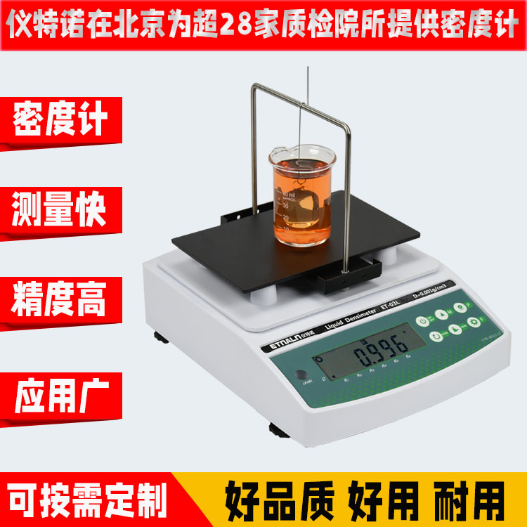其次,你還可以選擇實(shí)驗(yàn)室常用的液體密度計(jì)ET-03L、ET-04L,并配合恒溫水浴。將液體在恒溫水浴中恒溫至25攝氏度后,立即將其轉(zhuǎn)移到液體密度計(jì)測(cè)量平臺(tái)上進(jìn)行測(cè)試。這種方法只需幾秒鐘就能完成測(cè)量,能忽略溫度變化對(duì)密度結(jié)果的影響情況下使用,儀器單價(jià)成本更低一些。